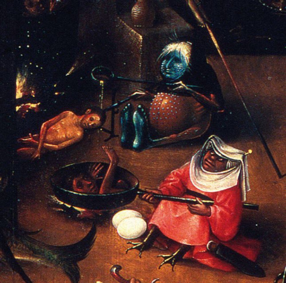 Jérôme Bosch nous met en garde contre les conséquences d’une vie corompue. La chute des anges rebelles sur le panneau de gauche marque le début de la fin. On note ensuite quelques élus au paradis, avec en dessous tout le reste, qui doit bientôt subir les tortures les plus cruelles.