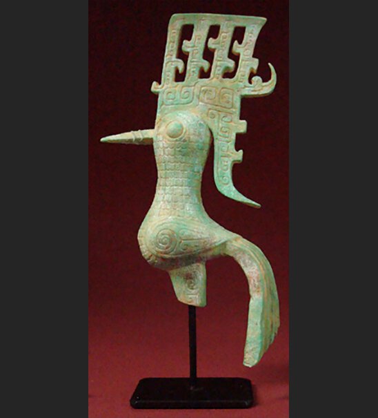 La dynastie Shang (1750-122 avant J.C.) est considérée comme étant la plus ancienne dynastie chinoise. Bien qu’il n’existait pas encore de royaume gouverné de facon centrale, une culture cohérente se manifestait pour la première fois dans une vaste région. Les premiers caractères chinois ont été trouvés sur des os d’oracle de la dynastie Shang. Au temps de la dynastie Shang, les objets en bronze n’étaient pas encore coulés selon la méthode devenue plus tard courante de la cire perdue. Une grande coquille d’argile était encore façonnée autour d’un noyau afin de couler ensuite le bronze entre cette coquille et le noyau. De nombreux objets d’art rituels en bronze ont été déterrés en 1989 à Sanxingdui dans la province de Sichuan, très loin du pouvoir central de la dynastie Shang. Leur stle artistique était unique et ils on été baptisés les bronze Shu. Les représentations animales trouvées servaient à l’origine pour la plupart de poigneées ornées de fûts rituels. L’oiseau était un suject favori, notamment le phénix mythique (Luan Feng), qui symbolisait le vent.