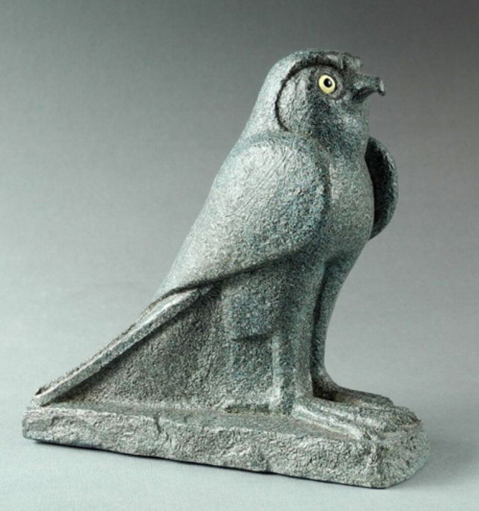 (715 – 332 avant J.C.). Le dieu-facon Horus est l’une des plus anciennes divinités égyptiennes et l’une de plus connues. Déja au cours de la période prédynastique (quatrième millénaire av. J-C.), le faucon était l’incarnation des forces cosmiques. Dans le très complexe panthéon égyptien, le faucon continua à occuper une place prépondérante par la suite, bien, que sa position et sa signifcation varièrent en fonction de l’endroit et de la période. La statue date de la Période tardive, une époque trouble au cours de laquelle les Perses conquirent une Égypte déjà morcelée. Plus tard, ces derniers furent chassés par Alexandre le Grand, grâce auquel L’Égypte intégra la royaume hellénistique. Le faucon a été découvert à Coptos, une importante ville de Haute-Égypte d’où partaient les routes commerciales vers la mer Rouge. Un de yeux d’ivoire incrusté a été perdu.