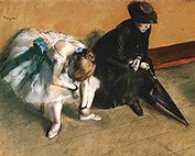 Degas s’intéressa très tôt au ballet et esquissa ses premières études de ballerines en 1872. Il évitait toutefois la véritable dramatique, la danse elle-même. Cette approche distante semble être le reflet de la vie de Degas. Lorsqu’une petite danseuse, un de ses modèles favoris, partit pour New York, ce célibataire apparemment indifférent la suivi par le prochain bateau, pour revenir en France sans avoir mis pied à terre. “Que peut-on faire de plus que de montrer que l’on est capable de suivre une dame de Paris à New York?”