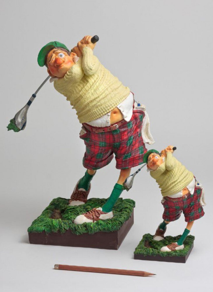 Il écarta ses pieds exactement comme il le fallait. Dans une parfaite synchronisation, il entama une rotation des épaules et de la taille tout en stabilisant un peu plus le genou droit. Tout d’abord, il regarda un instant le lointain objectif en esquissant un petit sourire de suffisance. Il continua son impeccable mouvement tout en fixant du regard la petite balle. Il demeura immobile quelques secondes et de toutes ses forces …il porta un coup terrible en arrachant une énorme motte de terre. La petite balle ne fut jamais retrouvée mais la motte de terre finit sa course sur la tête de l’arbitre, lequel dut être hospitalisé à cause d’un énorme hématome à l’œil gauche.