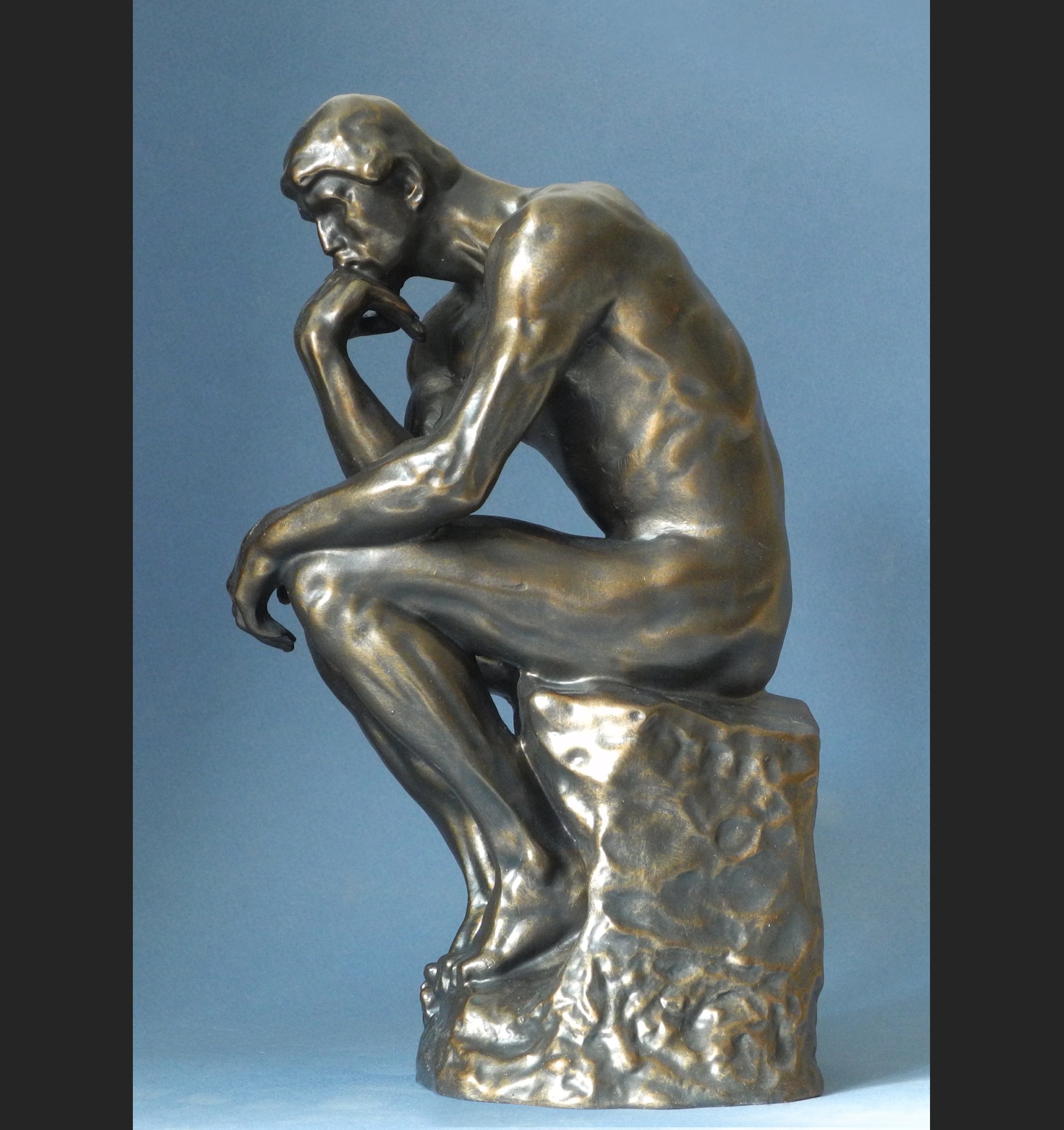 Rodin n’a jamais voulu dire à quoi pensait son Penseur, expliquant seulement il pensait: “Mon Penseur ne pense pas seulement avec son cerveau, sont front plissé, ses narines ouvertes et ses lèvres pincées, mais aussi avec chaque muscle de ses ras, de son dos et de ses jambes.” Le Penseur, l’une des œuvres les plus celebres de Rodin, faisait à l’origine partie des ‘Portes de l’Enfer’. Assis dans le tympan, le penseur contemple l’enfer: il juge les personnes d’en bas mais est également enfermé. Le Penseur fut la première œuvre de Rodin exposée en public. Elle fut placée devant le Panthéon le 21 Avril 1906, alors qu’une grave crise politique et sociale affectait la France. La statue fut plus tard transferée dans l’Hôtel Biron, actuellement musée Rodin et anciens ateliers de l’artiste.