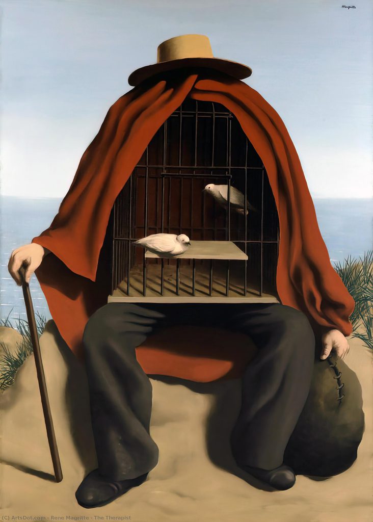 Avec Le Thérapeute, Magritte donne vie à un personnage qui est déjà apparu à plusieurs reprises dans son œuvre. Cette sculpture s’inspire toutefois d’une photo de 1937, intitulée Dieu, le huitième jour. Pour cette œuvre, il a réalisé un moule d'une personne existante, dont il a utilisé certains morceaux. La cage à oiseaux, elle aussi, est la réplique d'une vraie cage.
