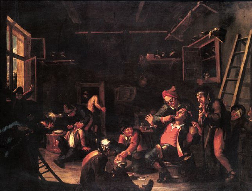 Au coeur de scènes chaotiques, le barbier tient fermement son patient.