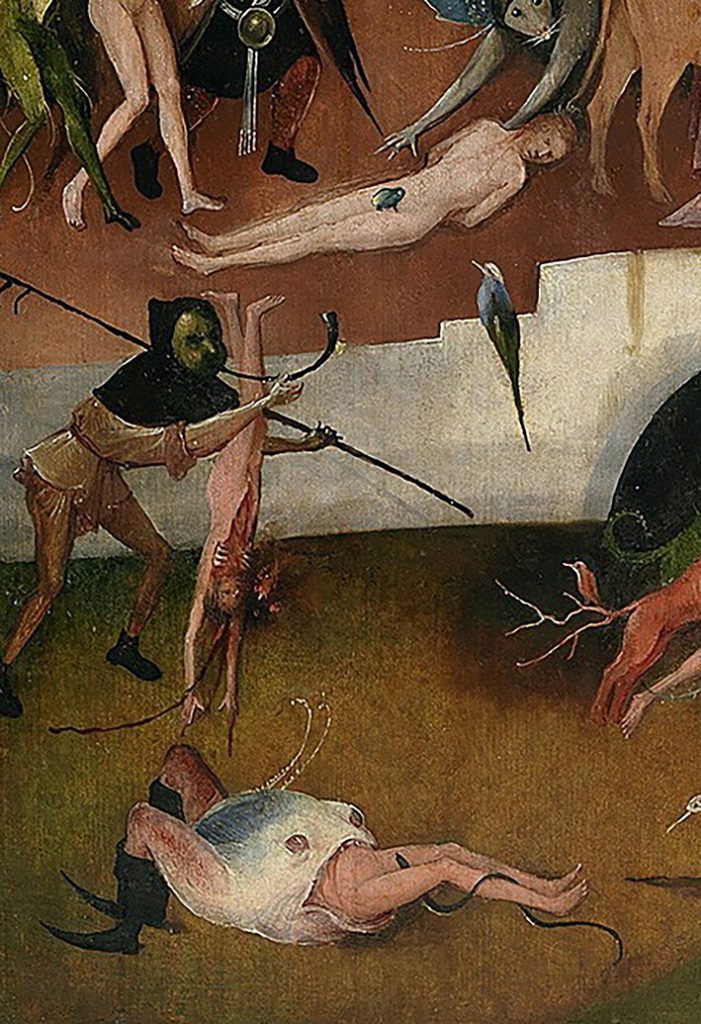 L'enfer horrible est représenté sur le panneau de droite du triptyque Haywain. Sous un pont, sur lequel les âmes damnées rencontrent leur destin, une âme est mangée par une créature ressemblant à un poisson. Le serpent qui s'enroule autour des jambes fait référence à la luxure pécheresse.