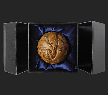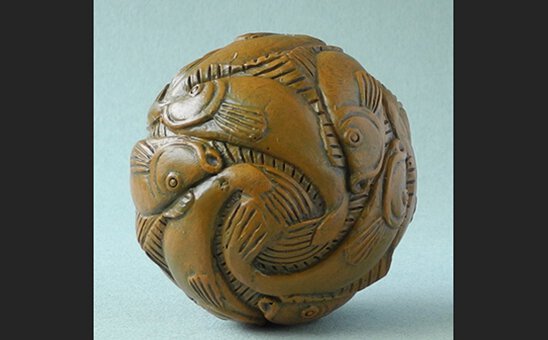 A quelques-uns de ses motifs sur des boules de bois. La forme sphérque, n’ayant pas de limite, se prête parfaitement aux systèmes par lesquels Escher exprimait l’infini.