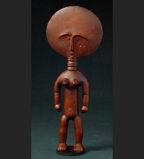 Les sculpteurs du peuple Ashanti sont célèbres pour leurs statuettes féminines connues sous le nom “d’Akua’ba”. Elles mesurent généralement entre 20 et 40 centimètres et ont une grande tête ronde et plate sur un corps stylisé. Cette forme est conforme à l’idéal de beauté des femmes Akan: front haut et plat, petite bouche et cou allongé orné de bijoux. Des forces surnaturelles sont attribuées à la statuette consacrée. Elle stimule la fertlité et aide à vaincre la stérilité. La femme porte toujours la statuette sur elle et la traite comme un enfant. Lorsque la statuette a fait la preuve de ses services, elle est deposée dans l’autel de la maison. Les petites encoches dans le visage sont destinées à protéger plus tard l’enfant contre les convulsions.